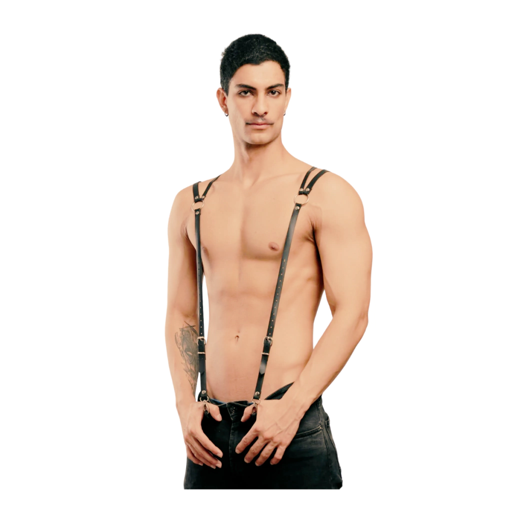 Arnés pectoral con tiradores de cuero regulable, con aros y detalles con tachas. Un accesorio que no te puede faltar